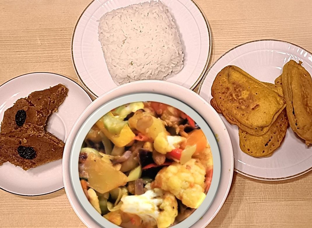 Kasviscurry, Beguni Tai Peazu tai Peruna Chop 3 Kpl, Riisi, hedelmäsalaatti tai shada golla tai halwa 2 kpl