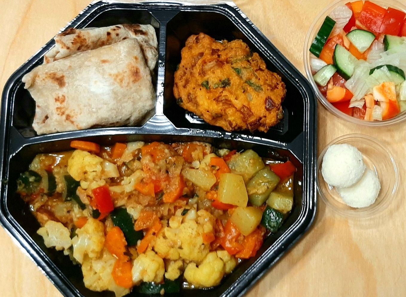 Kasviscurry, Ruti 4 KPL, Salaatti, Beguni Tai Peazu tai Peruna Chop 3 Kpl, hedelmäsalaatti tai shada golla tai halwa 2 kpl