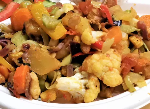 Kukkakaali, paprika, peruna, pähkinoitä, tomaatti, sipuli, valkosipuli, inkivääri, porkkana