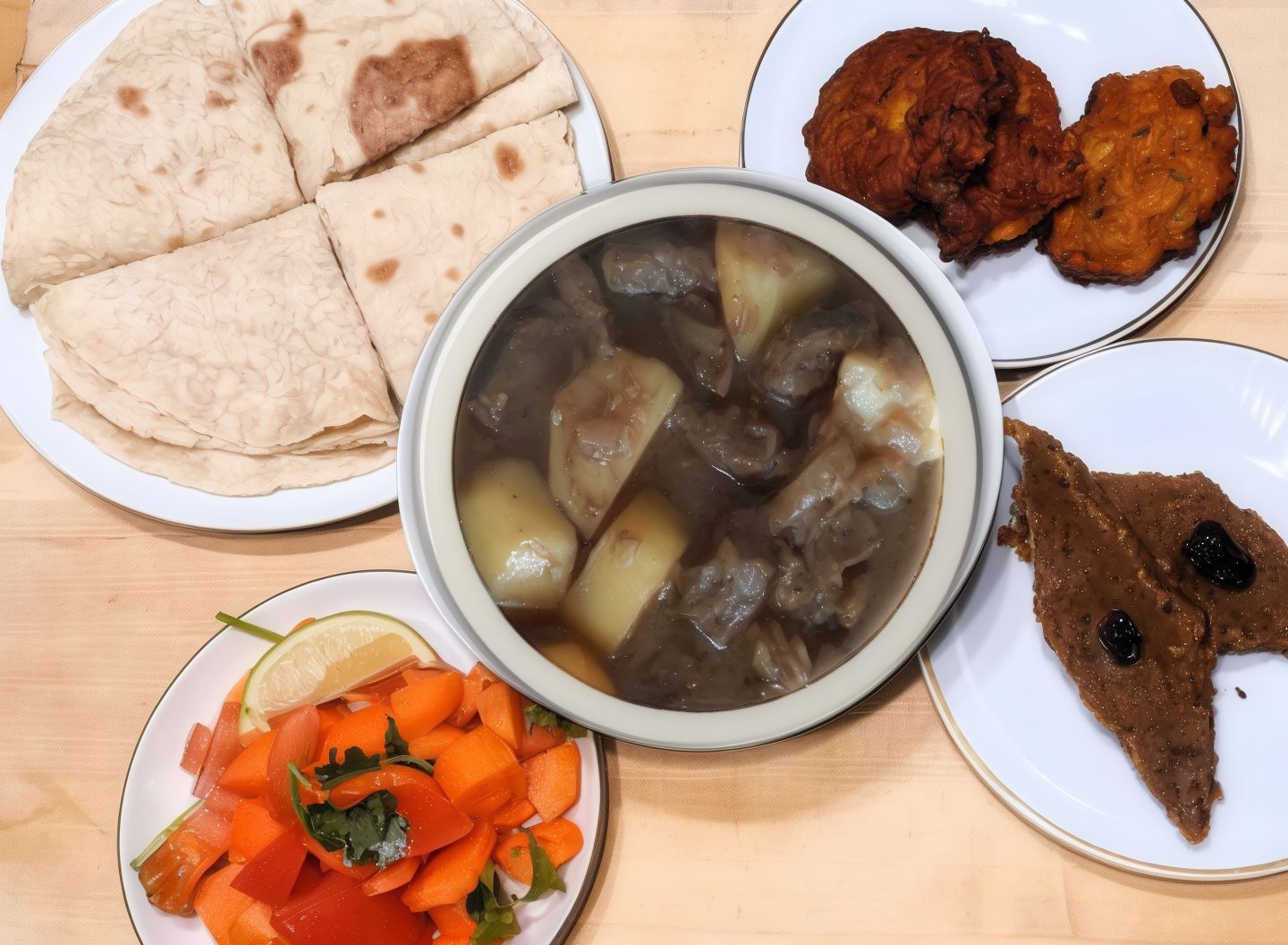Naudanbhuna, Ruti 4 KPL, Salaatti, Beguni Tai Peazu tai Peruna Chop 3 Kpl, hedelmäsalaatti tai shada golla tai halwa 2 kpl