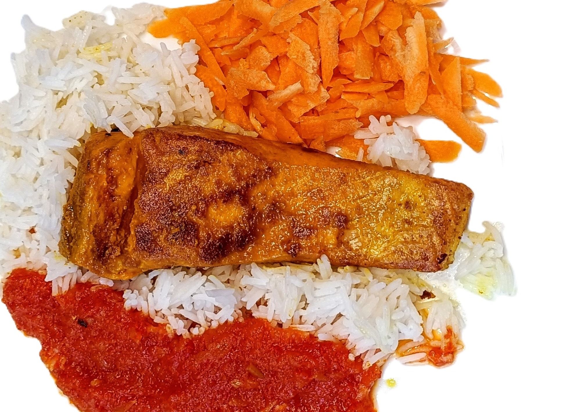 Ainekset: 100 gm Lohi, Riisi, porkana, tomaattikastike, suola, kurkumajauhe, chilijauhe, ripsiöljy, sipulia, paprikaa, mustapippuria